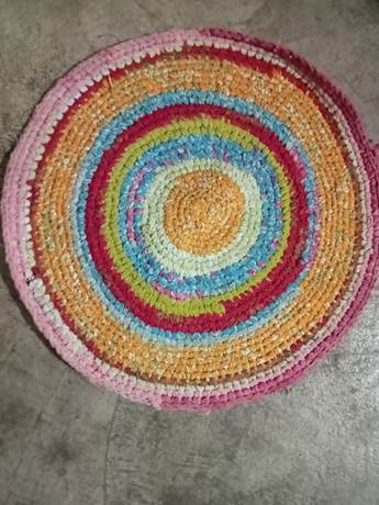 Smt. Ranjana Narendra Kukade after her household works find time to create mats and foot rest using torn sarees and other crafts.